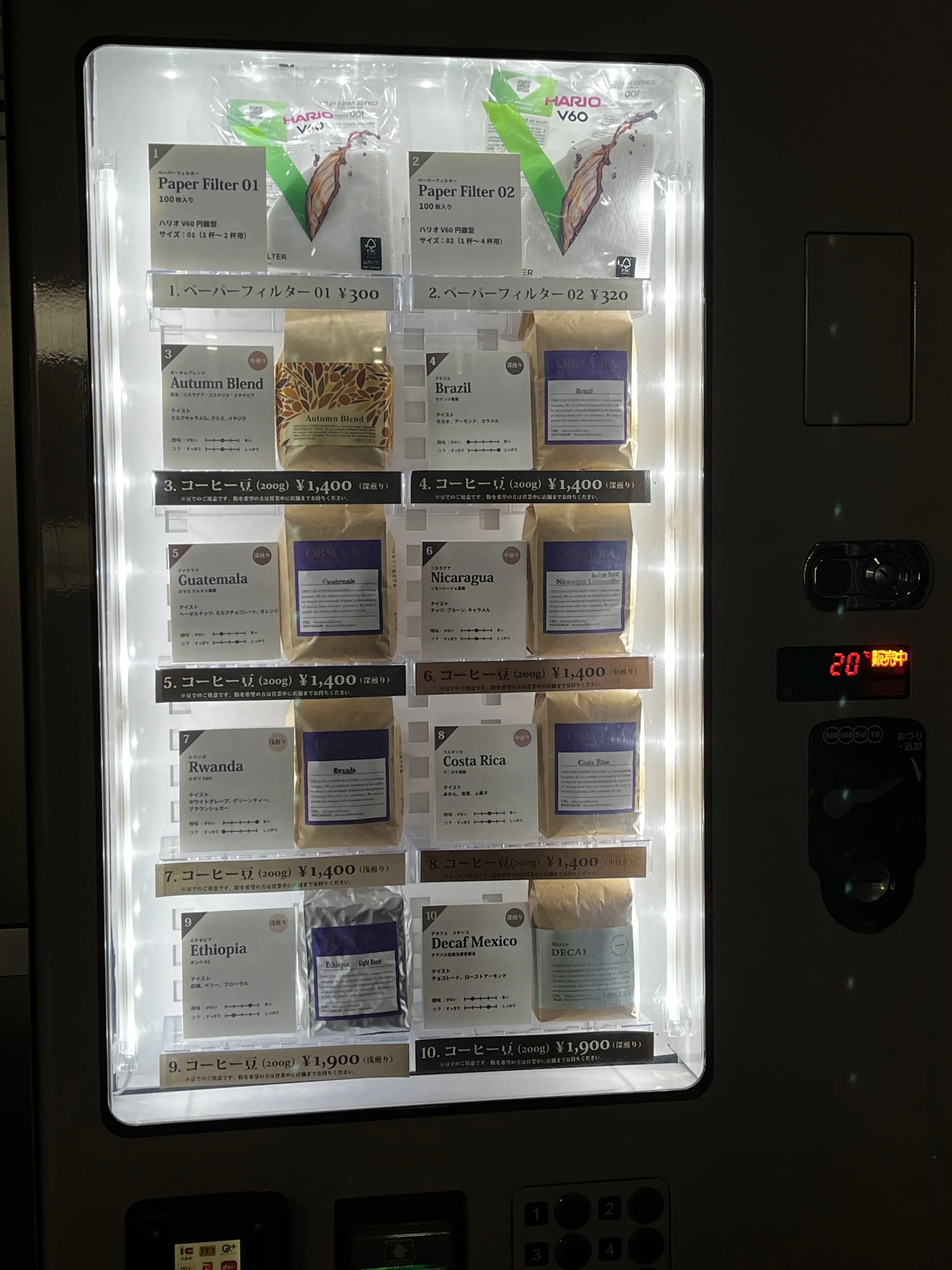 In our neighborhood of Sangenjaya, you can find fresh coffee beans from Obscura in a vending machine on the street. I think the prices are pretty close to what you’d pay at the store, so if you have a late-night coffee need and don’t want to slum it at the konbini, this is the place to go.