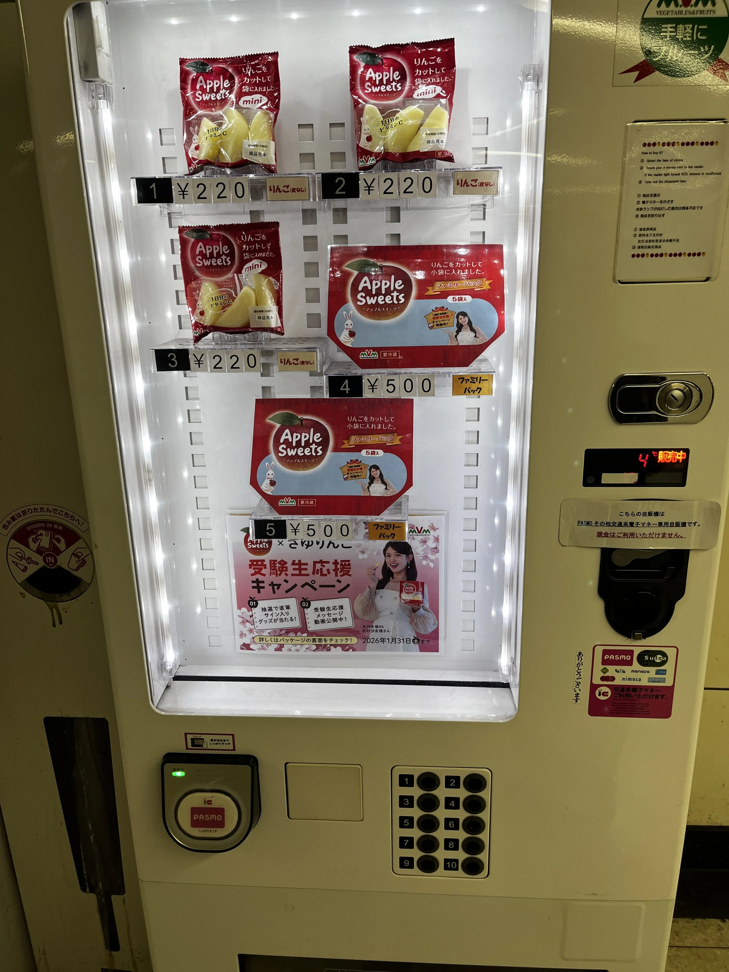 Lately, we’ve seen these Apple Sweets machines popping up. I assumed they were for parents to buy healthy snacks for little kids, but Eriko informed me that this is not the case. It’s actually for high school kids studying for exams who need an energy boost. I imagine zero high school kids are buying these, opting for crazy nitro sugar fuel instead.